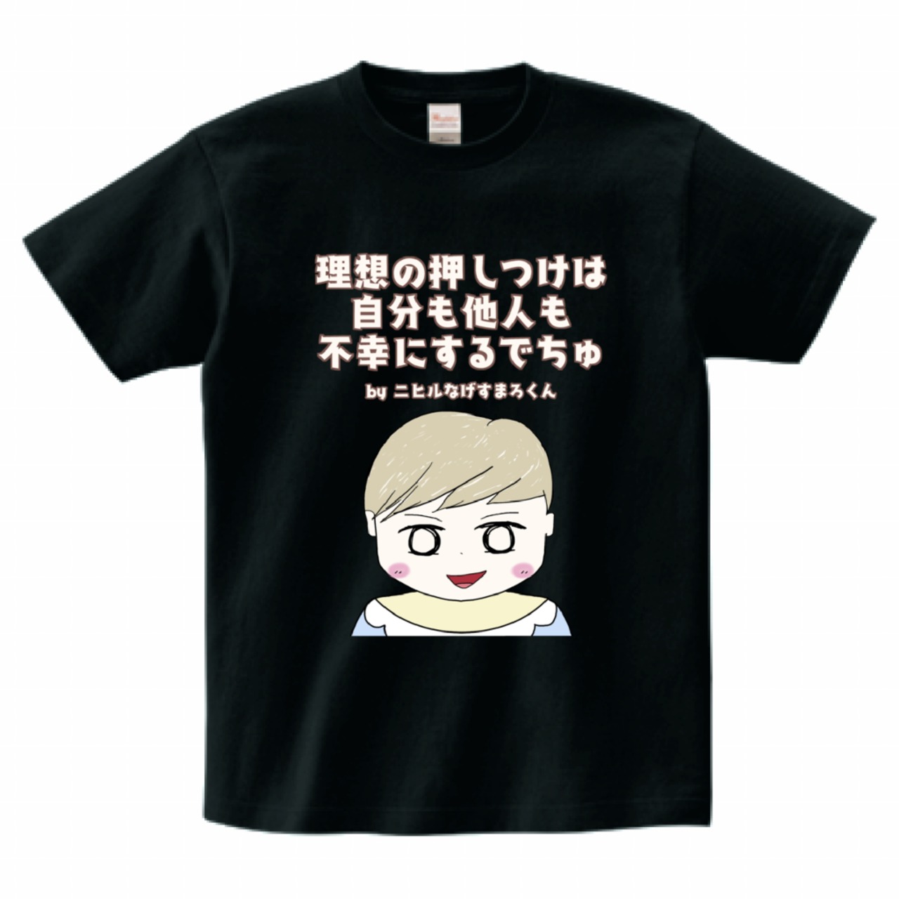 ニヒルなげすまろくんTシャツ(理想の押しつけは自分も他人も不幸にするでちゅ)黒